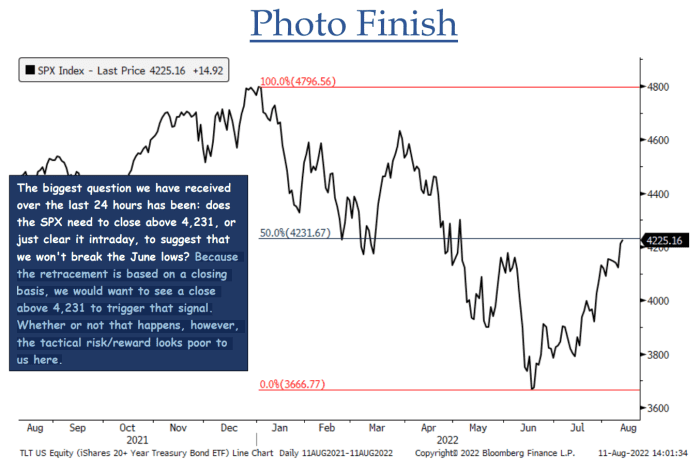 has rallied 14.7% off its 2022 closing low of 3,666.77 set on June 16. A close above 4,231 would mean the large-cap benchmark has recovered — or retraced — 50% of its fall from a Jan. 3 record finish at 4796.56.